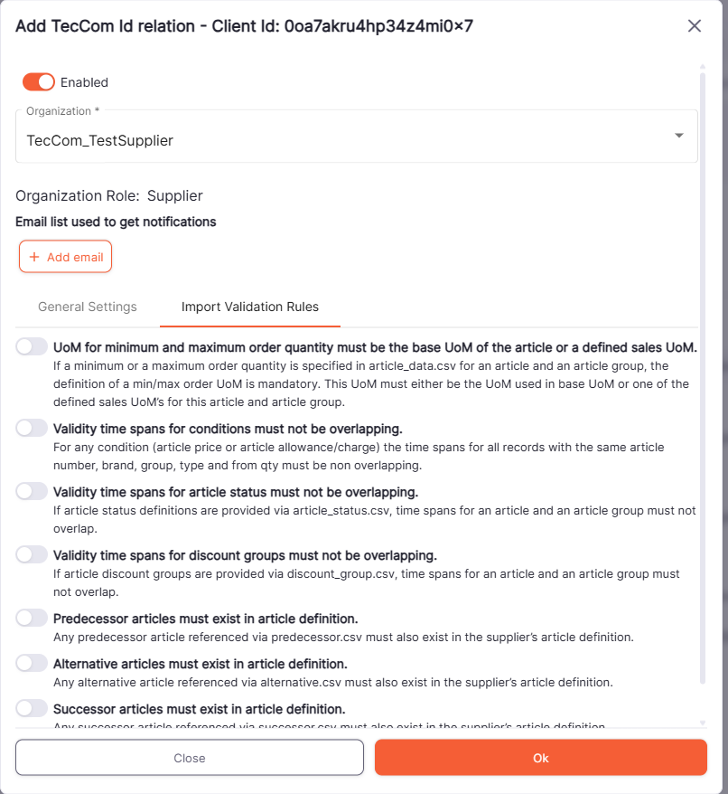 On tab Import Validation Rules (only Supplier) you can enable or disable rules for your import files. There will be a validation for imported data for enabled rules. You can download a report in TecCom Portal under Article Data - Business Cloud Monitor