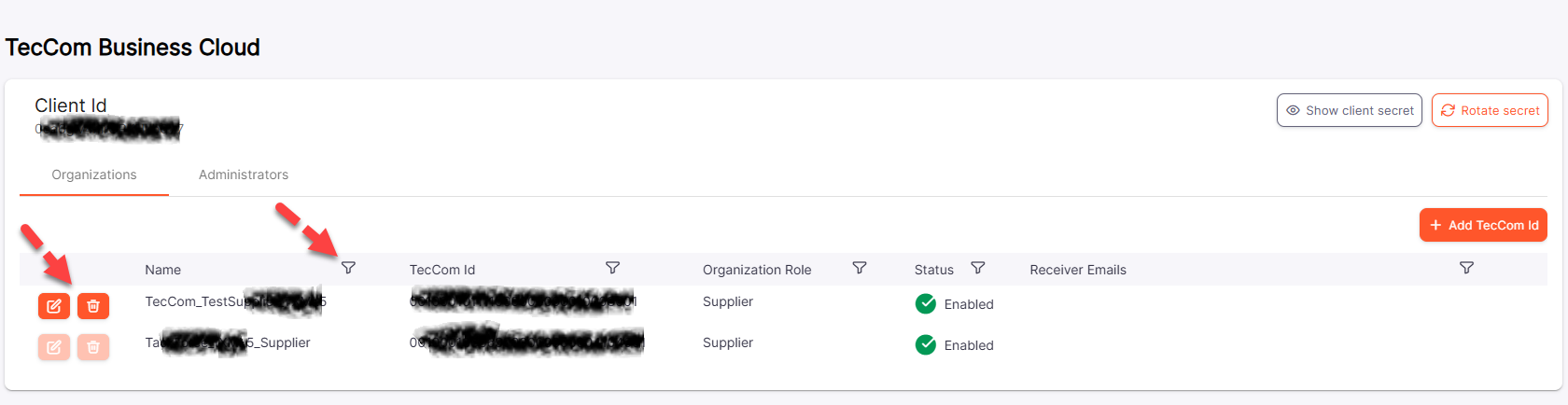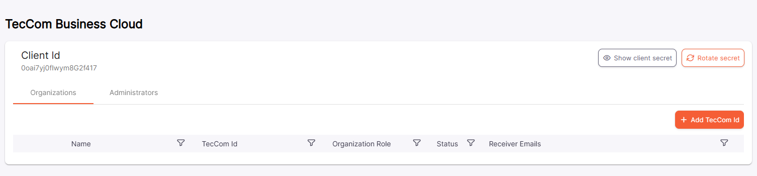 You can also add more administrators to this client. This client administrator can also retrieve the secret or rotate the secret, add, edit or remove organizations (with TecCom organization administration rights) or add more client administrators.