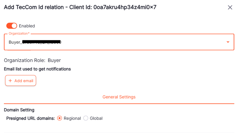 Click on the + Add TecCom Id button on the Organization tab. A window will be opened where you can select your supplier organization for which you have organization admin rights.
